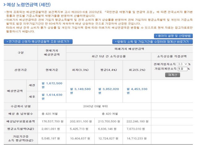 인증을 하고 국민연금 예상수령액을 조회하면 현재가치 국민연금 예상수령액과 미래가치 예상수령액도 알 수 있습니다. 또 국민연금 수급개시 년월도 확인하실 수 있습니다.