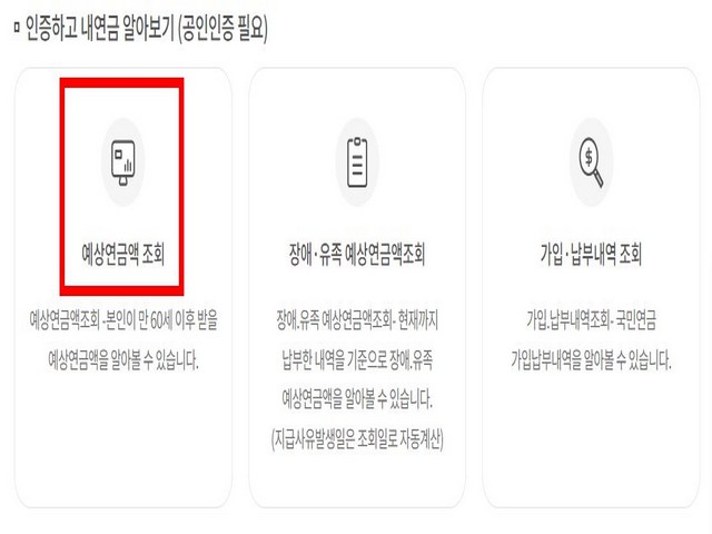 1. 국민연금공단 홈페이지 - 내 연금 알아보기 - 인증하고 내 연금 알아보기 - 예상연금액 조회 클릭합니다.
