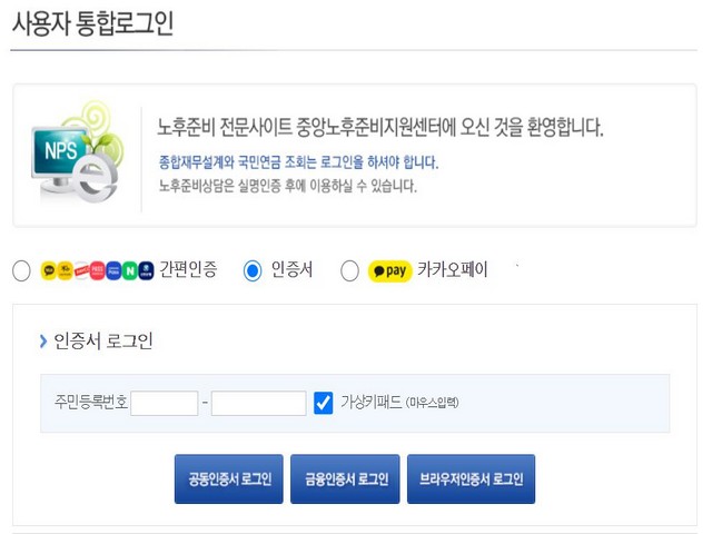2. 사용자 통합 로그인 화면- 간편 인증, 인증서 등으로 본인인증하기 - 예상 노령연금액(세전)을 확인할 수 있습니다.