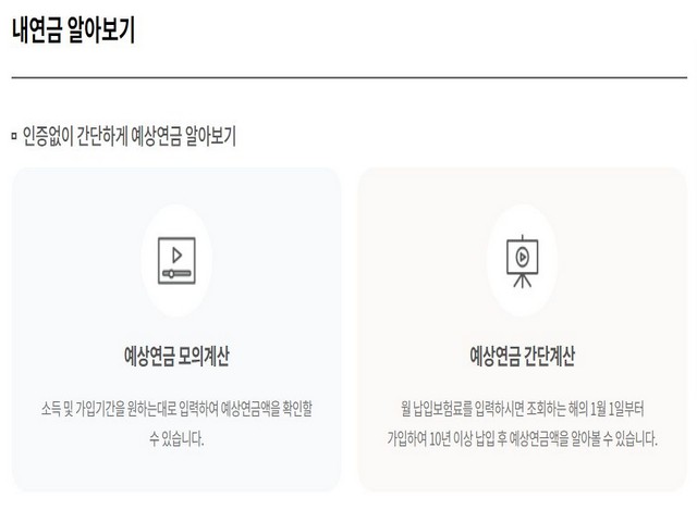 2. 예상연금 모의계산 또는 예상연금 간단 계산 클릭 -  인증서 없이 예상연금을 알아볼 수 있습니다.