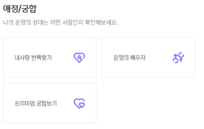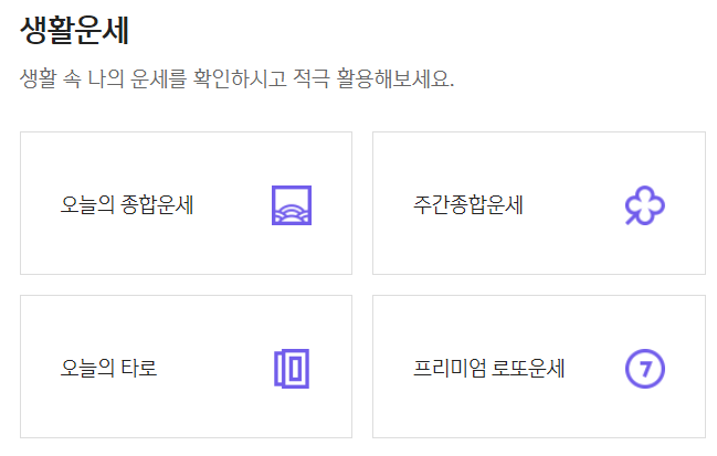 생활운세에서는 오늘의 타로, 로또운세를 볼 수 있고, 애정궁합에서는 반쪽 찾기, 운명의 배우자 등 재미로 볼 수 있는 운세도 확인해 볼 수 있습니다.