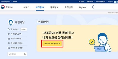 3.보조금24 로그인 후 - 나의 맞춤혜택 - 보조금24 이용동의하기를 클릭합니다.
