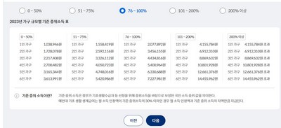 2. 개인(가구)-거주지역-생년월일, 성별-소득금액 구간 선택-해당되는 부분 클릭-개인특성정보-가구특성정보 선택 -다음버튼을 누릅니다.