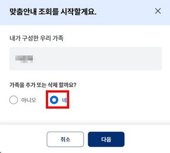 4. 맞춤안내 조회를 시작할게요 화면- 내가 구성한 우리가족 - 가족 추가 또는 삭제에서 [네] 선택 - 다음을 누릅니다.