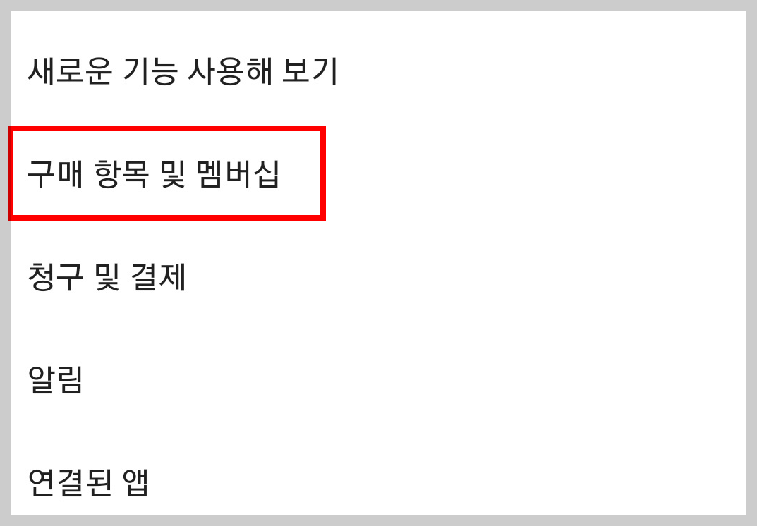 2. 설정 - 구매 항목 및 멤버십을 클릭합니다.