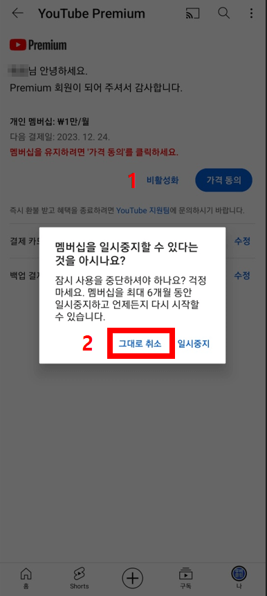 화살표 부분을 클릭 후 비활성화 - 그대로 취소를 누르면 유튜브 프리미엄이 최종 해지가 됩니다.