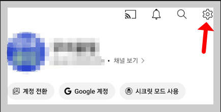1. 유튜브 왼쪽 하단의 유튜브 프로필 계정을 클릭한 후 오른쪽 상단 톱니바퀴를 클릭합니다.