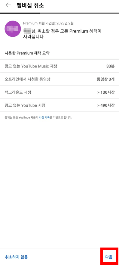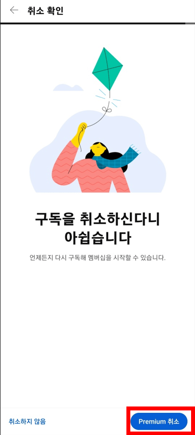 4. 멤버십 취소 - 다음을 클릭하면 취소확인 화면이 나오고 프리미엄 취소를 클릭합니다.