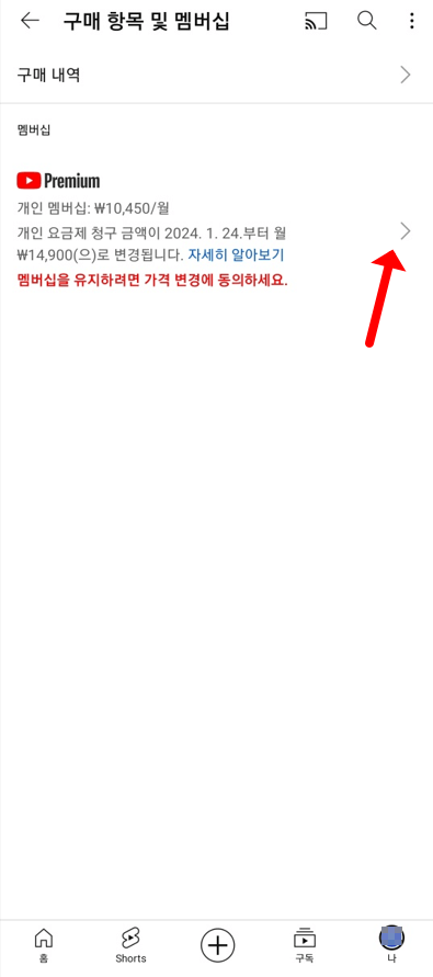 3. 구매 항목 및 멤버십을 클릭하면 유튜브프리미엄 구매내역 안내되고, 가격인상에 대한 정보도 나옵니다.