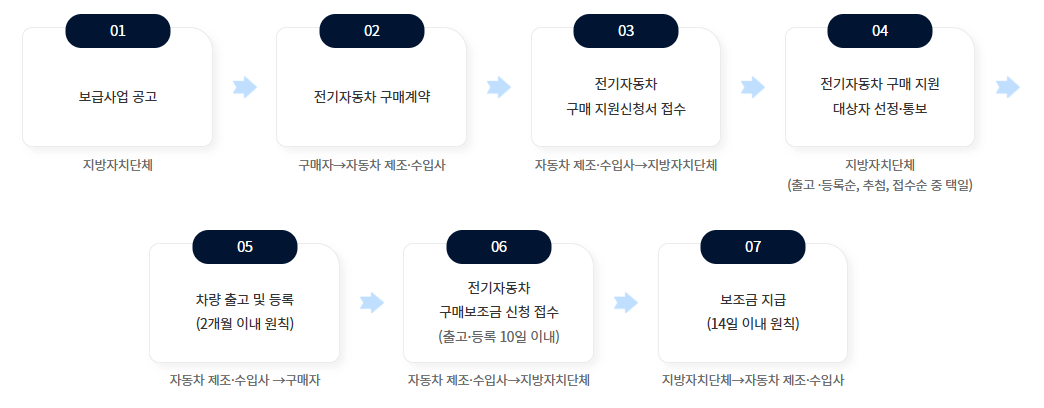 전기차 구매자는 차량구매 금액과 보조금의 차액을 자동차 제조 및 수입사에 납부하고, 자동차 제조, 수입사는 지방자치단체(국가보조금+지방보조금)로부터 보조금 수령하는 방식으로 진행됩니다.