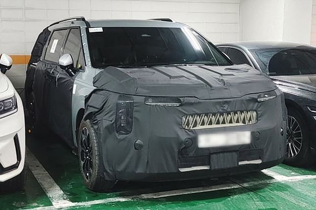 세로형 그릴과 헤드램프 등 EV9나 더 뉴 쏘렌토와 유사한 모습으로 하단이 좁아지는 형태의 라디에이터 그릴이 사각형태로 변경되었습니다. 또 안쪽 패턴도 입체적인 마름모 패턴이 적용되었고 세로형 램프와 스타 맵 시그니처 램프가 적용된 모습입니다.